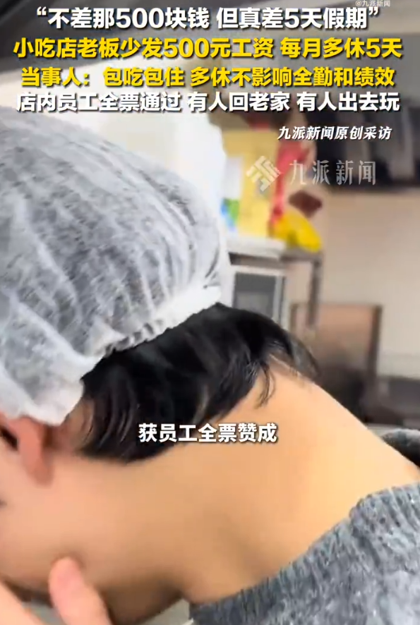 近日,武汉一家小吃店雇主的酌量举措——多休5天假,激勉温存并赢得颇多好评。他在视频中暗意,多休5天假对应少结算500元工资,但保证住宿待遇照常享有,不影响全勤奖和绩效工资的派发。12月5日,21岁的伙计小周暗意,11月30日,雇主在酌量时候已毕后,召集群众开会,群众一致答允的“少发500块,但放假10天”决议,就在12月1日运行实行。 12月初,群众迅速开启了“放假阵势”。“本日开完会,第二天就有东谈主运行休了。”小周和另又名共事,目下仍是放假5天;还有一位共事买了机票,谈论本周末回四川玩。小周趁着放假,回到桑梓荆州处理一些事情,见到了久违的一又友们,心理畸形兴奋。他告诉记者,随即会回到店里上班,留几天假期在武汉济急用。 问及小周对雇主的印象,他称“应聘时见到罗先生,感到不可念念议。我方在武汉打工的‘费心’,齐能得到惩处”。另外,小周还炫夸,他在店里职责六个月的真确情况是,每个月齐能存上钱,现已存了一笔济急钱;店里的氛围也很好,群众齐是00后,在一齐漫批驳地,也一齐打工挣钱。